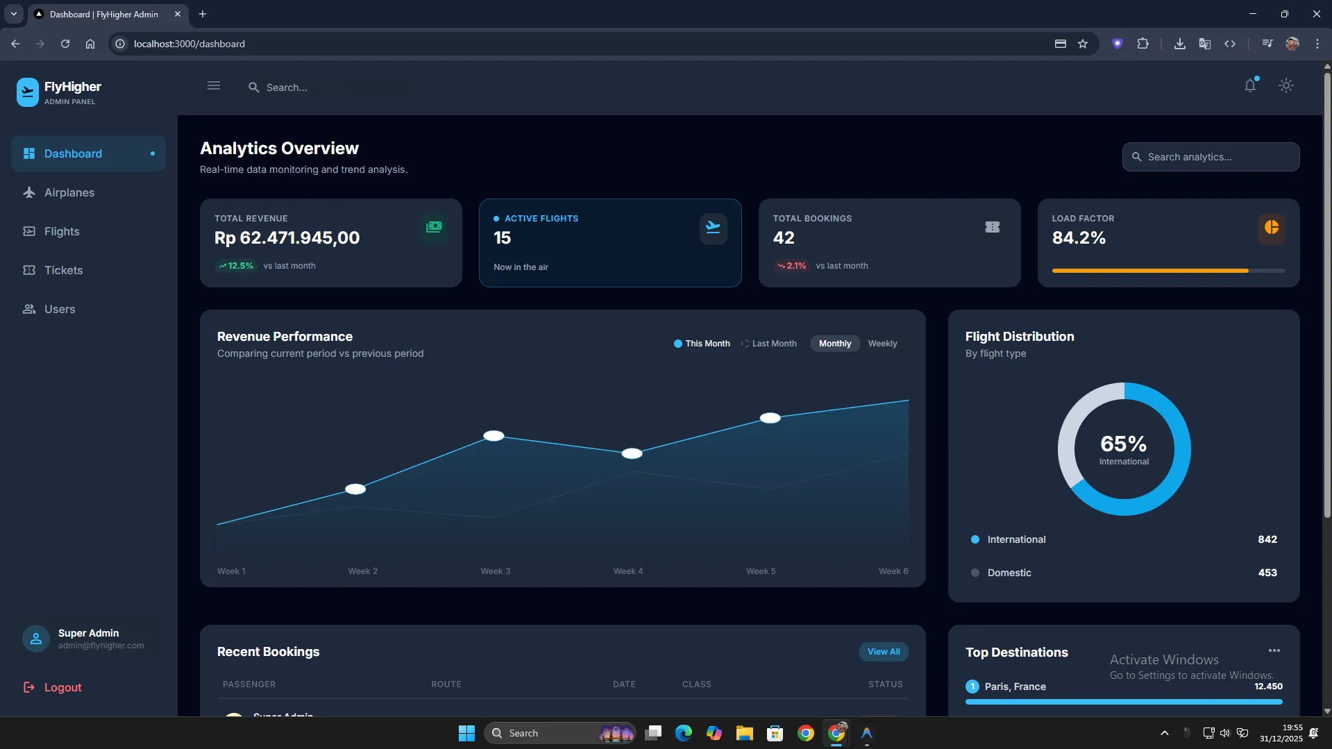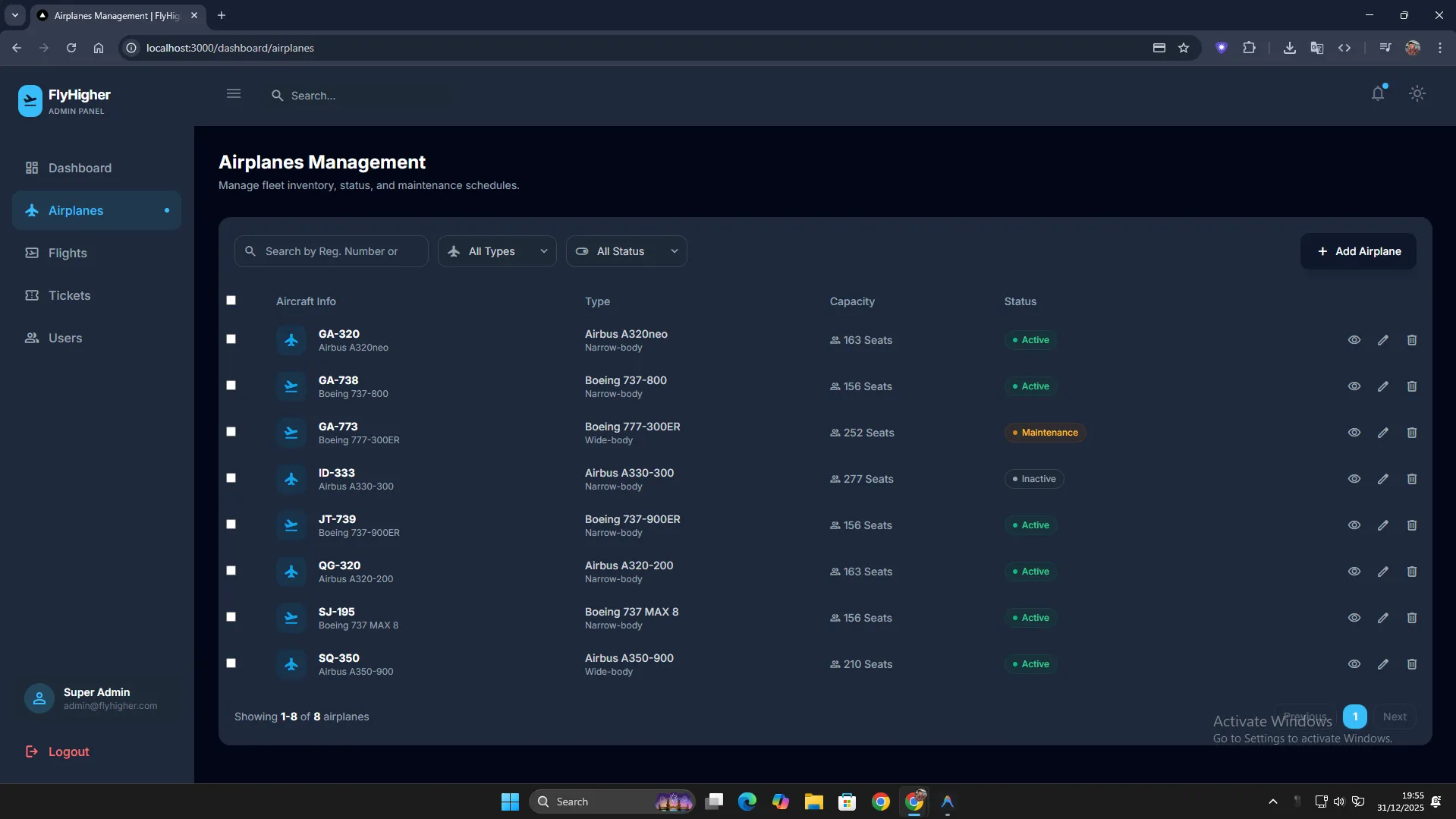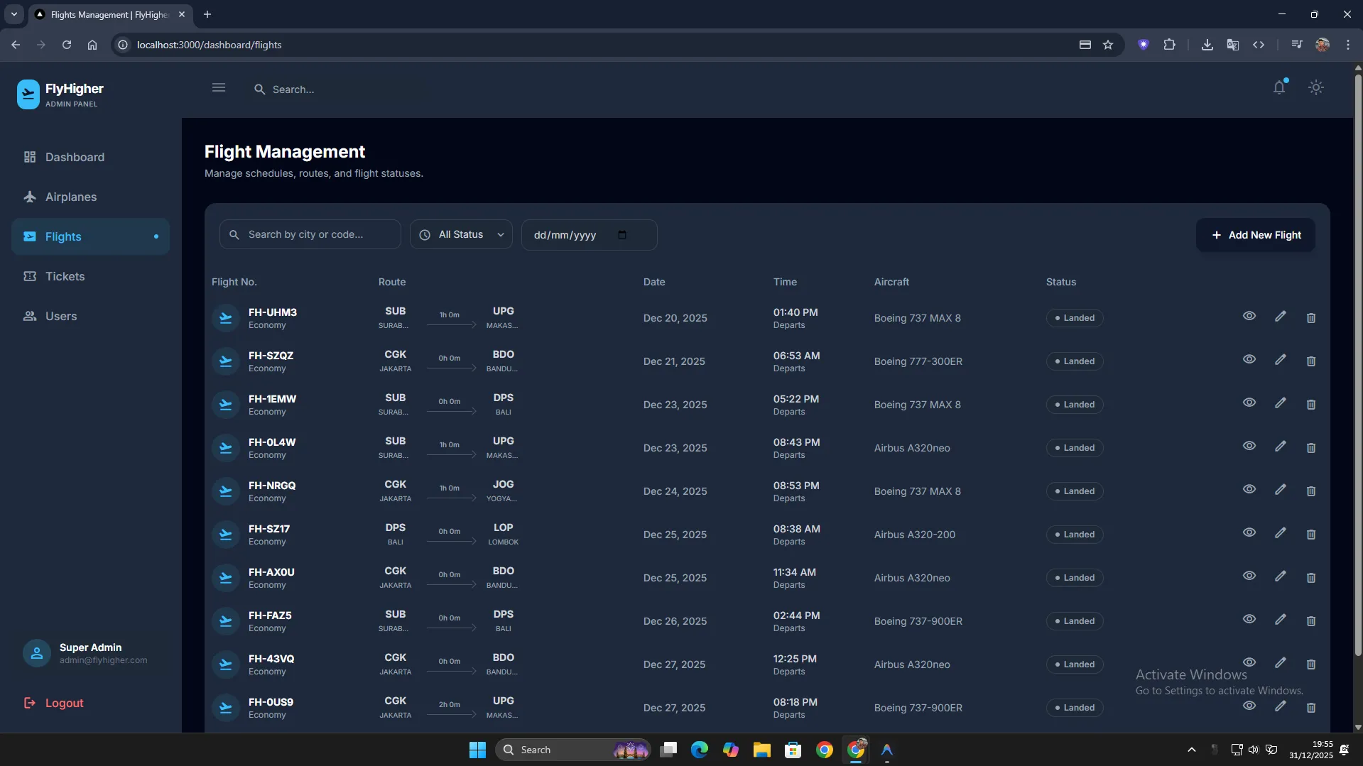 Complete dashboard for airlines to manage schedules and pricing.