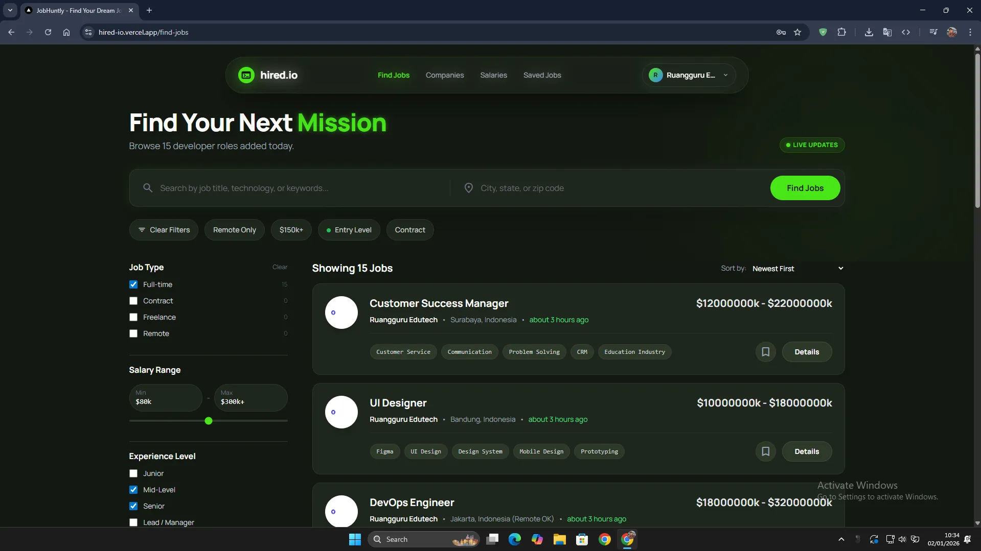 Search jobs with filters for category, location, salary, and type.